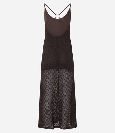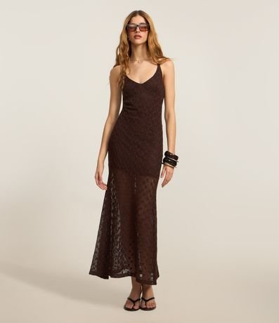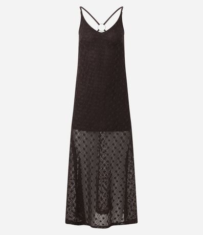 Ref: Vestido feminino confeccionado em tricô, peça no modelo new midi com decote em, alças finas cruzadas nas costas com aviamento e forro mais curto promovendo transparência abaixo dos joelhos.
