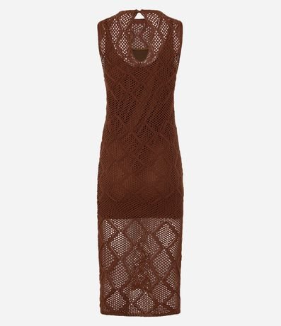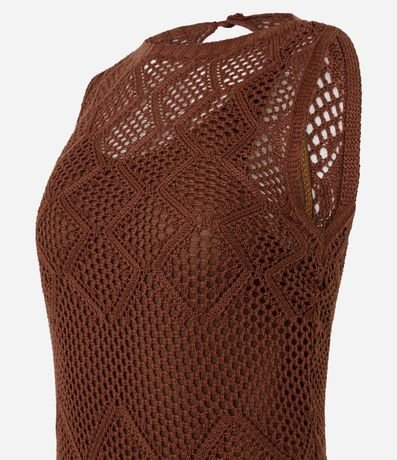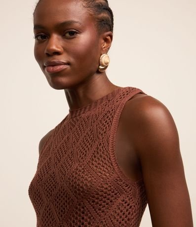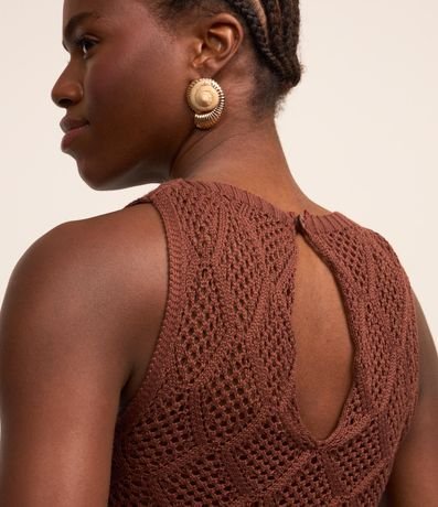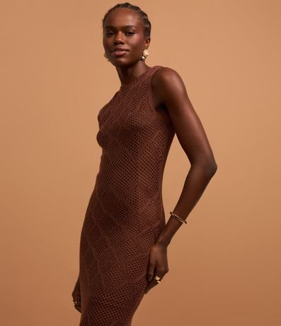 Ref: Vestido new midi, em tricô leve, sem manga com decote halter, ponto crochetado, forro e recorte vazado nas costas.