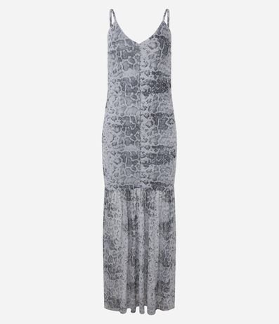 Vestido new midi confeccionado em tule forrado, alças finas, franzido nas laterais e costas. Possui estampa animal print e babado na saia.
