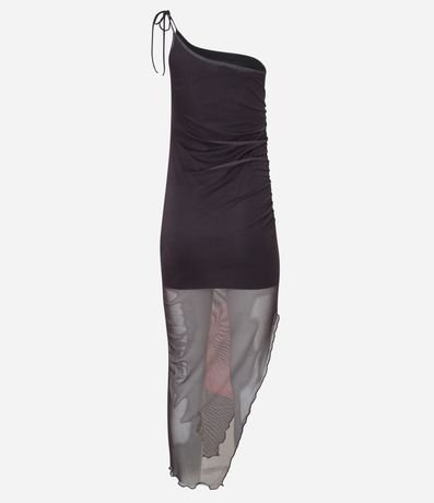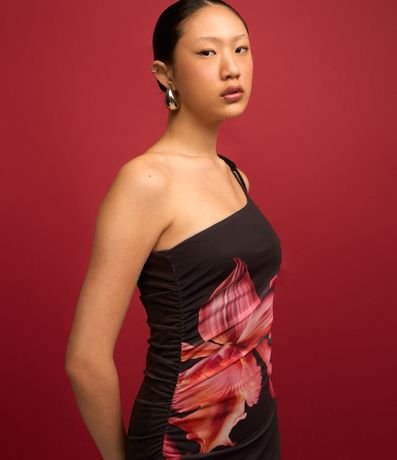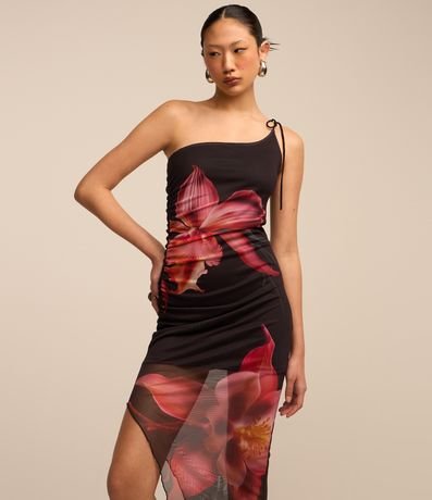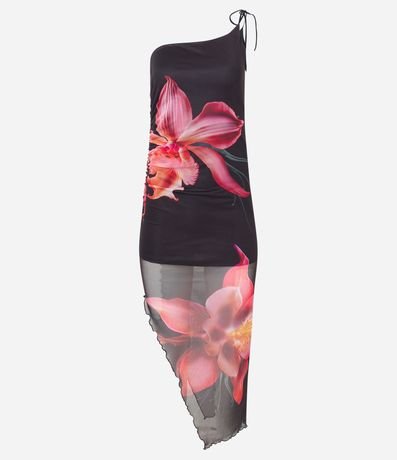 Ref: Vestido new midi com um ombro só, alcinha fina com amarração no ombro, assimétrico e com estampa de flor.