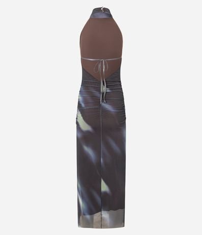 Ref: Vestido new midi, frente única com gola alta, reto com amarração nas costas abertas, franzidinhos laterais e estampa abstrata manchada.