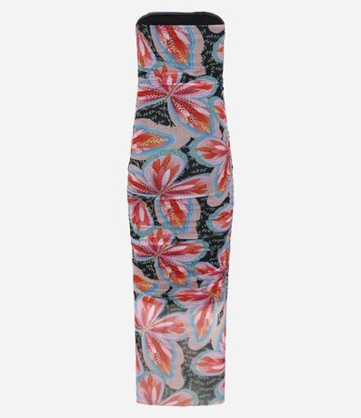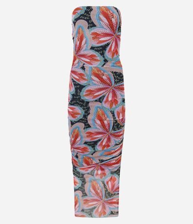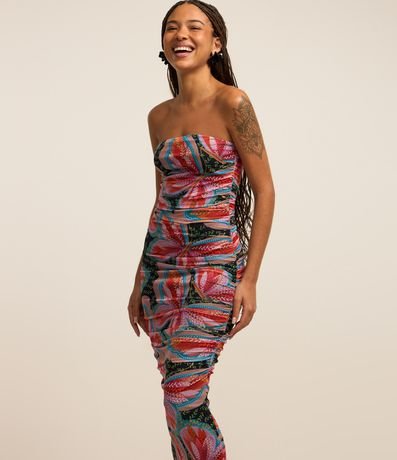 Ref: Vestido tomara que caia, new midi com drapeado na lateral e com estampa tropical de flor.