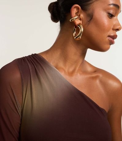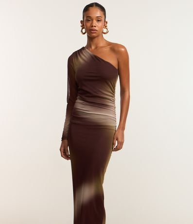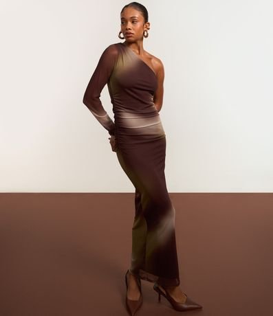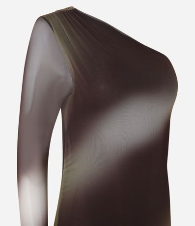 Vestido new midi com decote um ombro só, confeccionado em tule manchadinho, forro interno e transparência na manga longa.