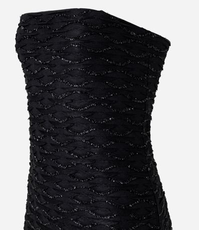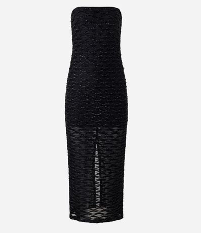 Vestido new midi com decote tomara que caia, forradinho, confeccionado em tule metalizado, fenda na parte de trás e efeito ondinhas.