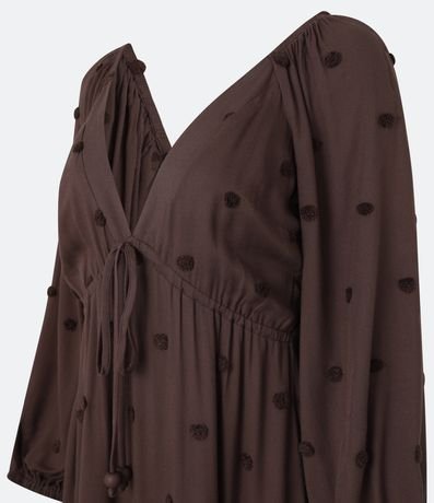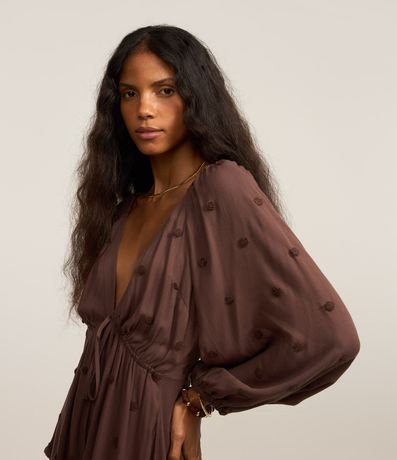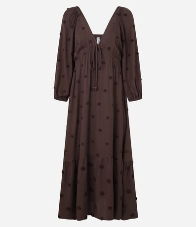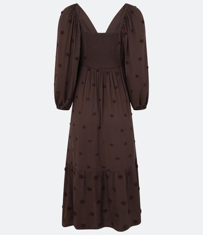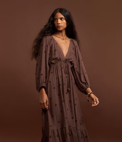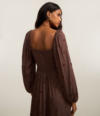 Vestido new midi feminino, confeccionado em twill. A peça conta com decote cavado na parte frontal, mangas longas soltinhas, com efeito bufante, lastex nas costas e bolinha bordadas.