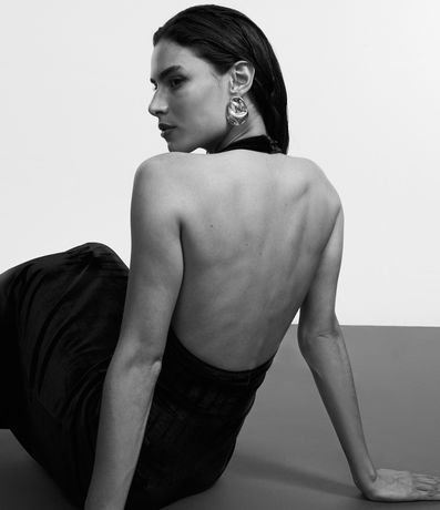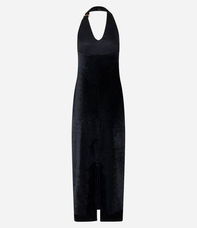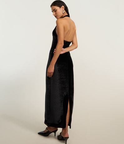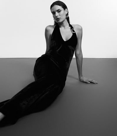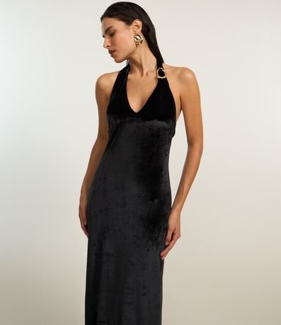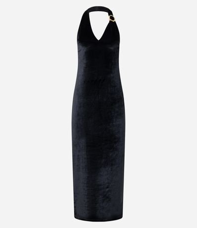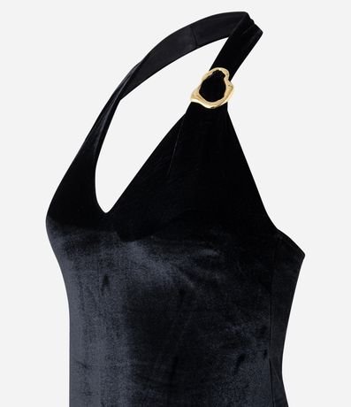 Vestido new midi, frente única com alça larga, confeccionado em veludo e com aviamento frontal na alça.