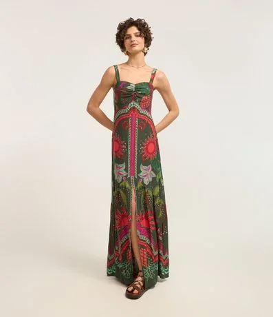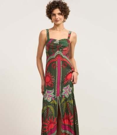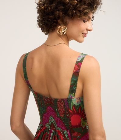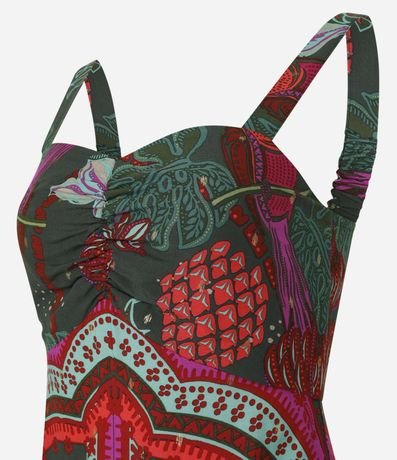 Ref: Vestido new midi com alça larga, decote coração com franzido no busto e estampa tropical.