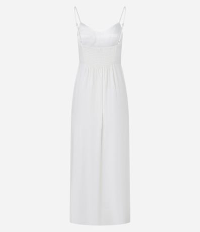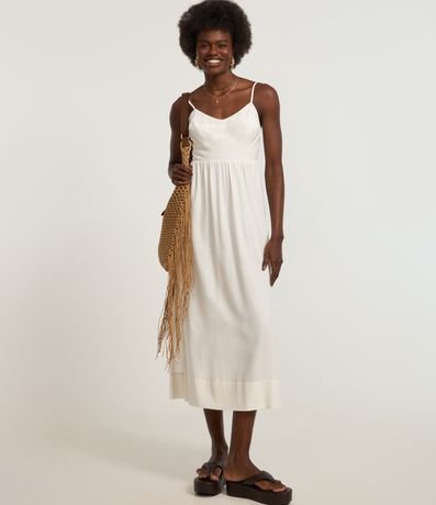 Vestido new midi com alcinha fina regulável, confeccionado em viscose certificada mais sustentável e linho, bisco marcado e lastex nas costas.