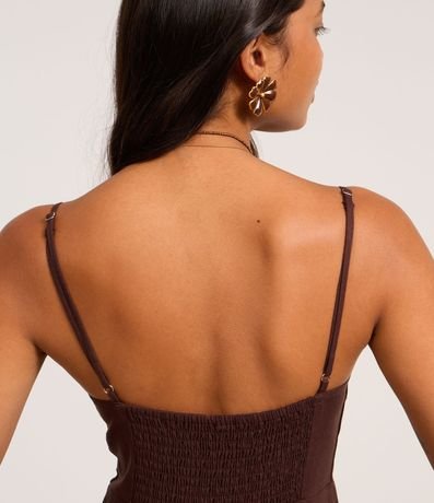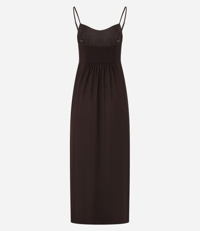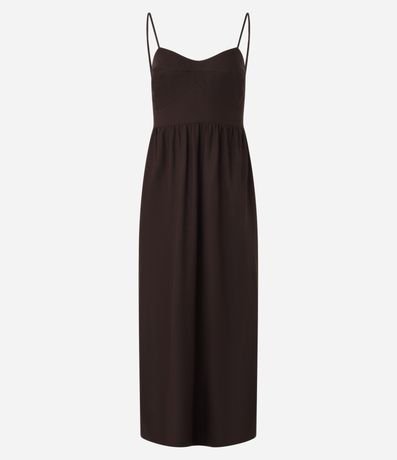 Vestido new midi com alcinha fina regulável, confeccionado em viscose certificada mais sustentável e linho, bisco marcado e lastex nas costas.