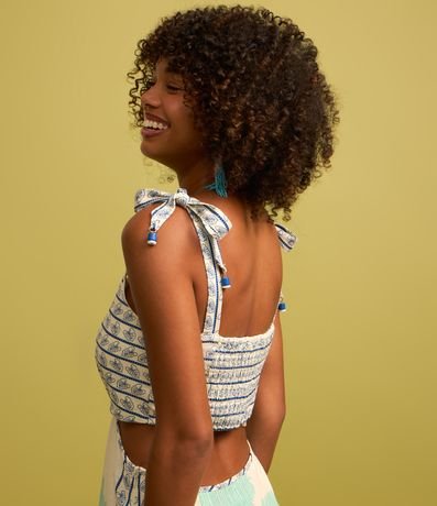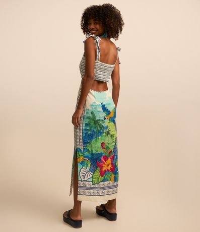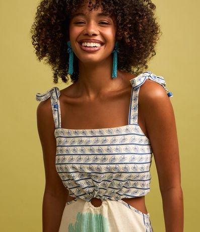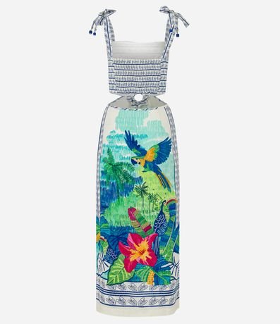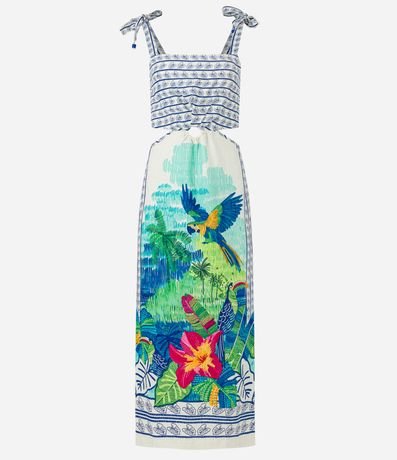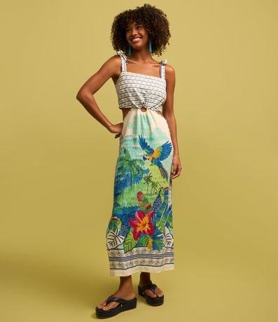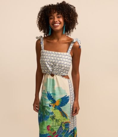 Ref: Vestido new midi com amarração nas alças, lastex nas costas, confeccionado em viscose e linho, recorte vazado frontal e nas laterais, fenda na lateral e estampa estilo tropical com coqueiros.