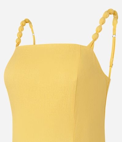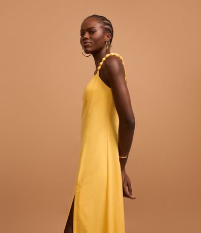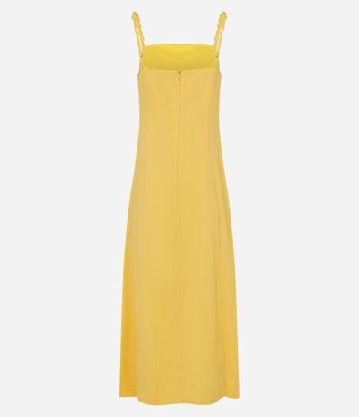 Ref: Vestido new midi com bolinhas nas alcinhas, confeccionado em viscose e linho, fechamento por zíper nas costas.