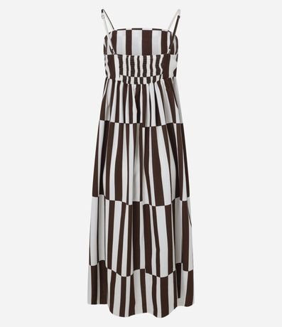 Vestido de alcinha, com comprimento new midi, de decote reto e alças reguláveis. Possui recortes e estampa de listras.