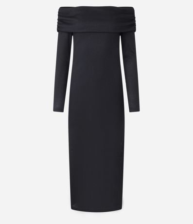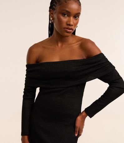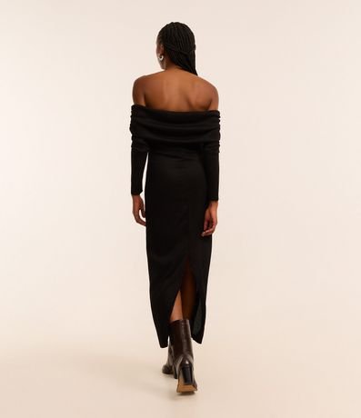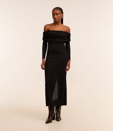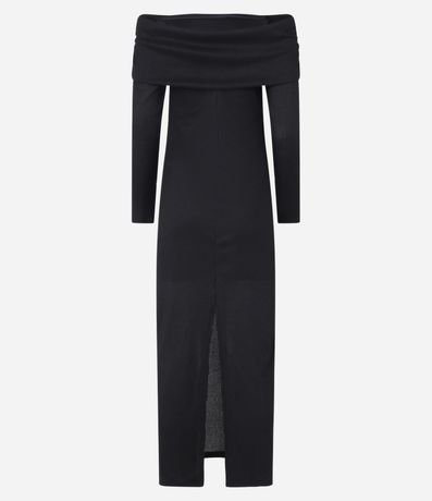 Ref: Vestido new midi com decote ombro a ombro, confeccionado em ribana canelada, manga longa e fenda na parte de trás.