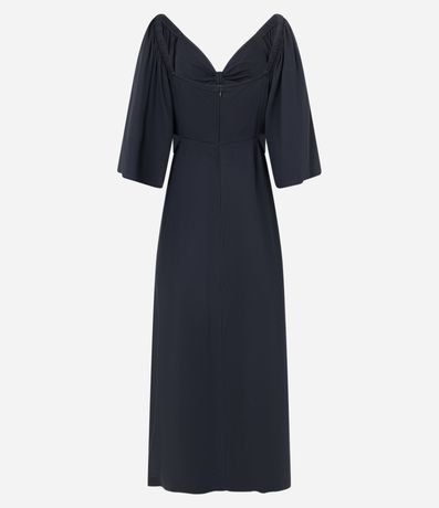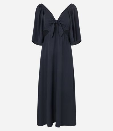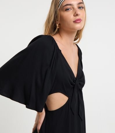 Ref: Vestido new midi confeccionado em viscose com decote V com laço para amarração no busto, mangas amplas godês, aberturas vazadas nas laterais e fechamento traseiro por zíper.