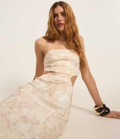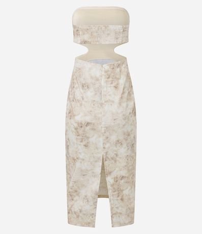 Vestido feminino no modelo new midi, confeccionado em bengaline com decote redondo, sem manga, detalhe de recortes laterais, lastex nas costas, zíper, fenda e estampa manchada com semelhança à mármore.