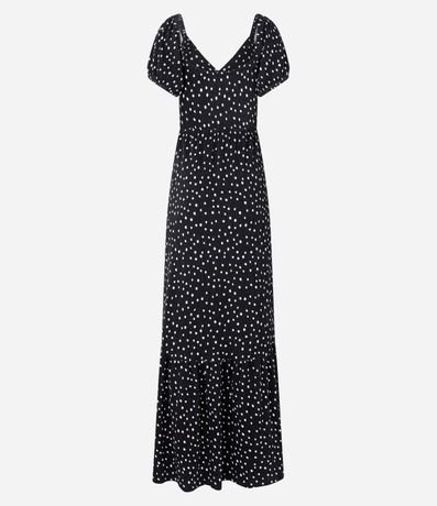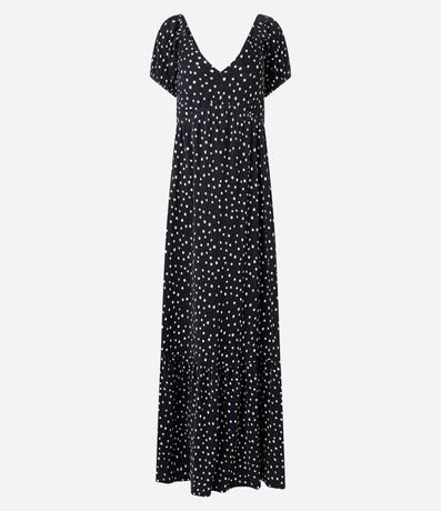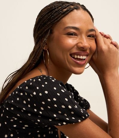 Ref: Vestido new midi com decote coração, confeccionado em viscose texturizada, estampa poá e babado na barra.