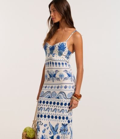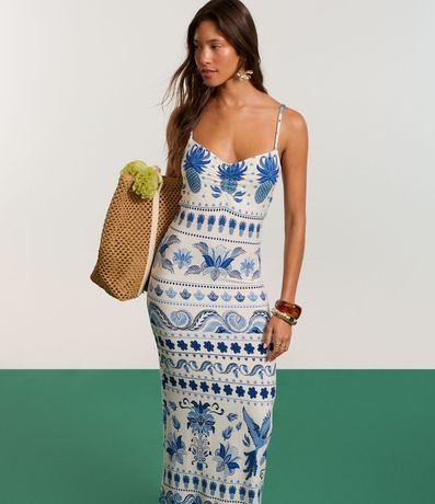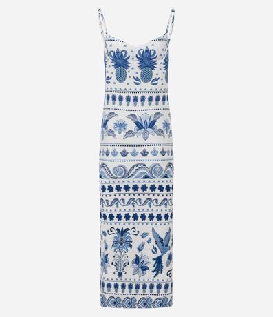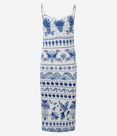 Ref: Vestido feminino justinho, confeccionado em ribana de viscose, com decote franzido e alcinhas finas. Texturizado, possui estampa de tema tropical com abacaxis, flores e pássaros.