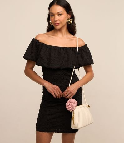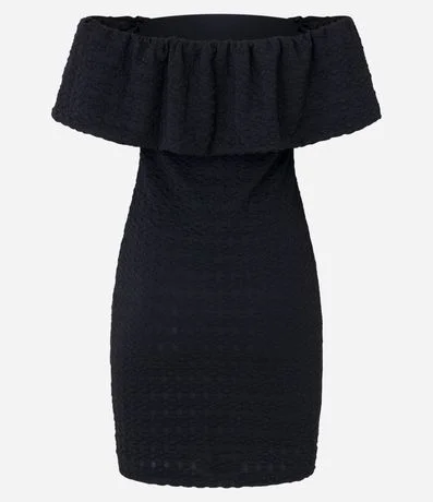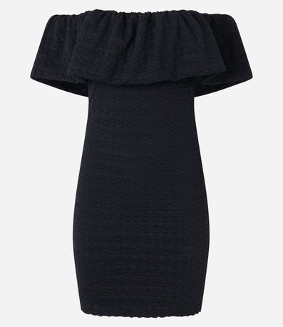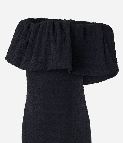 Ref: Vestido ombro a ombro feminino, com babado, modalagem justa ao corpo e superfície texturizada.