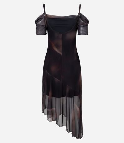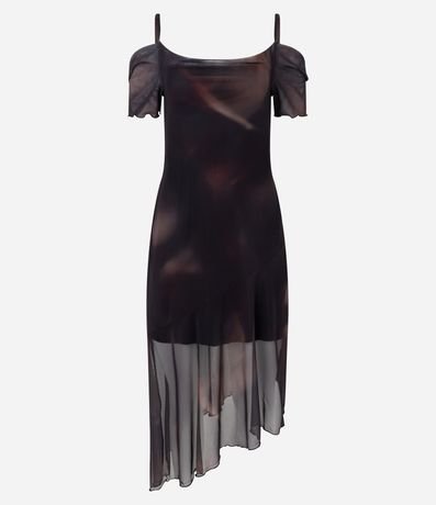 Ref: Vestido confeccionado em tule com decote a ombro a ombro, sobreposição, barra assimétrica e estampa abstrata. Possui frufrus nas mangas e na barra.