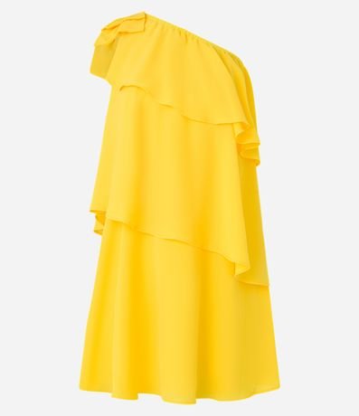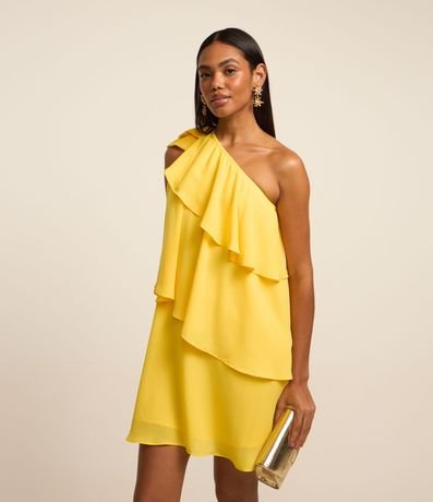 Ref: Vestido ombro só curto feminino, confeccionado em chiffon, com babados sobrepostos e superfície sem estampa.
