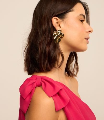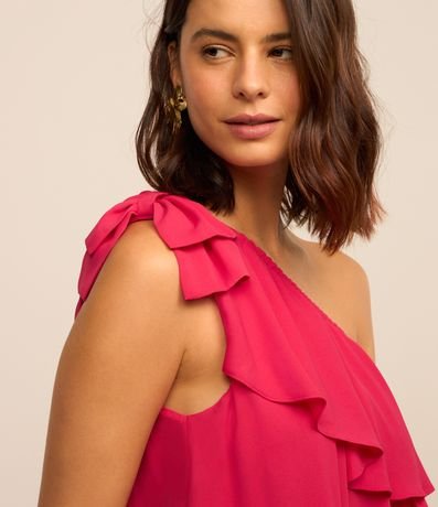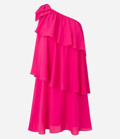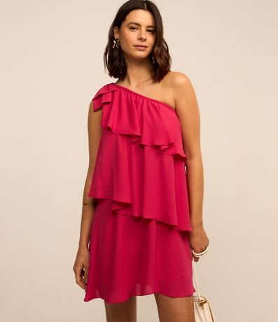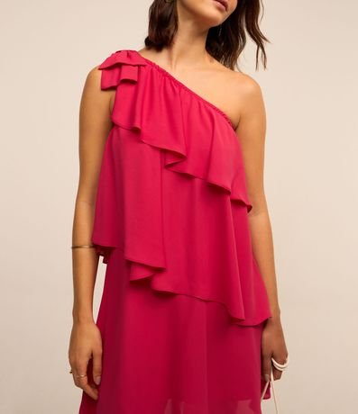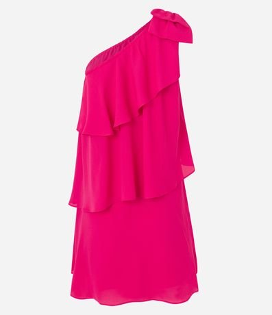 Ref: Vestido ombro só curto feminino, confeccionado em chiffon, com babados sobrepostos e superfície sem estampa.