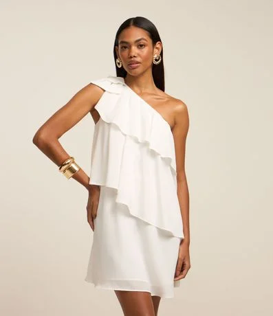 Vestido ombro só curto feminino, confeccionado em chiffon, com babados sobrepostos e superfície sem estampa.