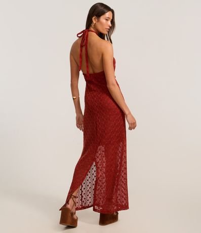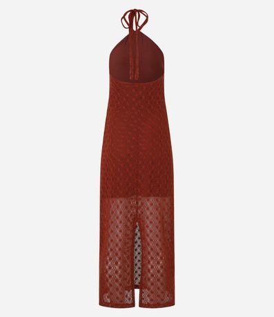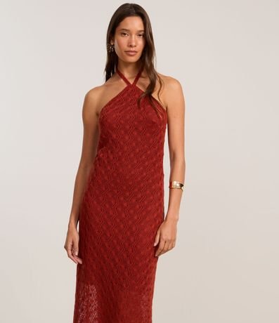 Ref: Vestido long midi, reto com decote frente única, amarração no pescoço com alça fina, texturizado e com fenda na parte de trás.