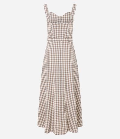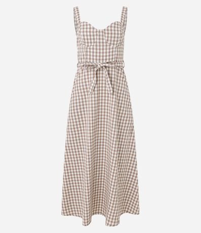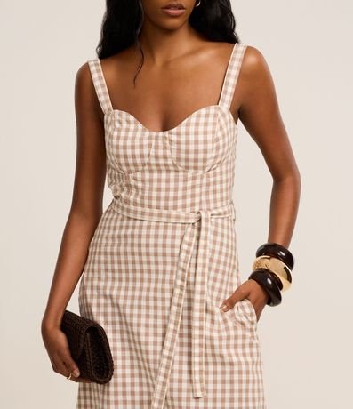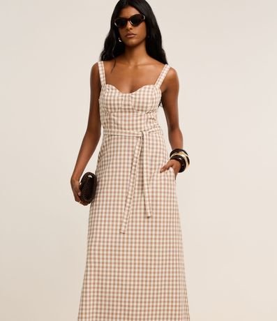 Ref: Vestido reto alongado, confeccionado em sarja, com decote coração, alças largas, passantes na cintura, cinto de tecido para amarração e estampa xadrez vichy. Este produto possui algodão certificado em sua composição, sendo ambientalmente mais responsável.