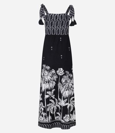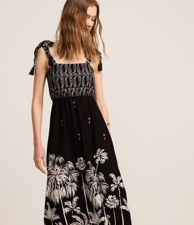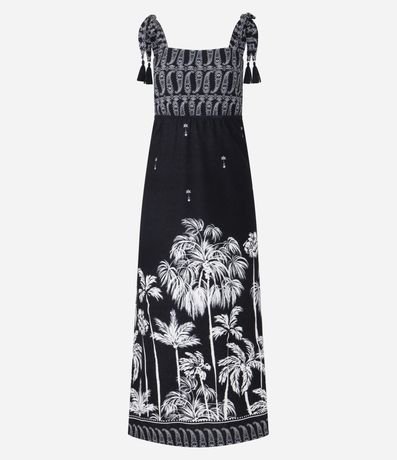 Ref: Vestido reto midi e sem mangas, confeccionado em algodão, com decote reto e alças médias com amarração. As alças tem franjinhas e o vestido conta com estamparia paisley no busto e de coqueiros na saia. Este produto possui algodão certificado BCI em sua composição, além de ter sido produzido através de processos mais sustentáveis com boas práticas ambientais, sendo ambientalmente mais responsável.