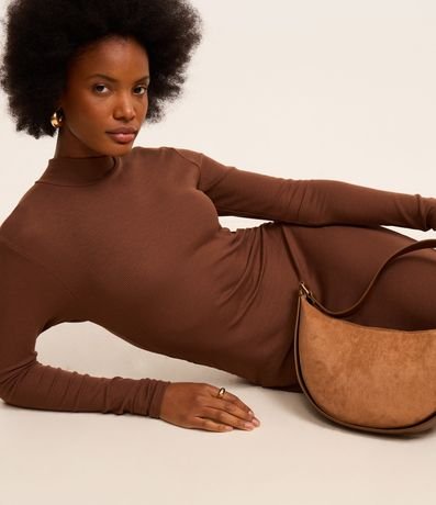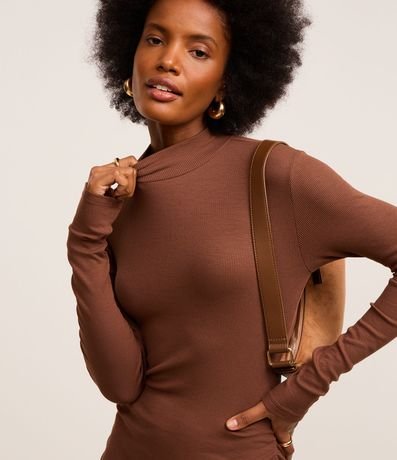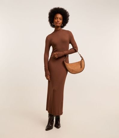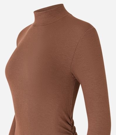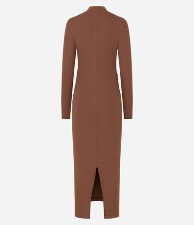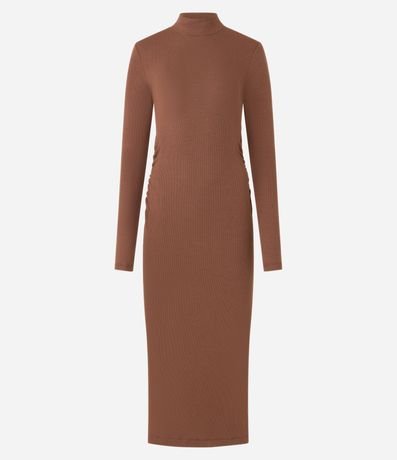 Ref: Vestido reto de comprimento midi, confeccionado em ribana, com gola alta e mangas longas. Peça tem franzido lateral e malha toda com textura canelada. Produto fabricado através de boas práticas ambientais.