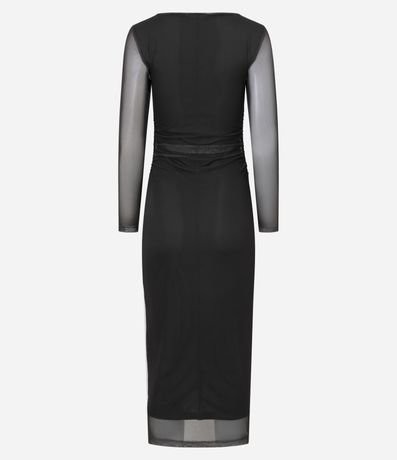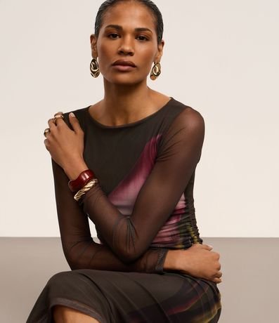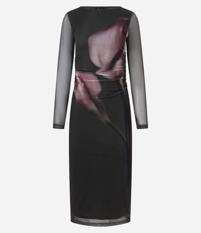 Vestido reto midi de mangas longas com transparência, confeccionado em tule, com decote canoa e estampa floral com flores copo-de-leite. A estamparia possui leve efeito blur, que é um efeito borrado. Este produto foi fabricado através de processos mais sustentáveis, adotando boas práticas ambientais.