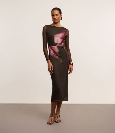 Vestido Reto Midi em Tule com Estampa Flora Blur
