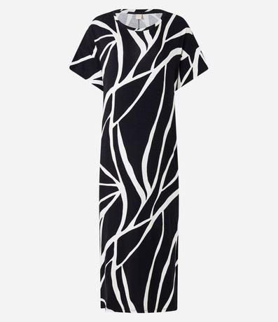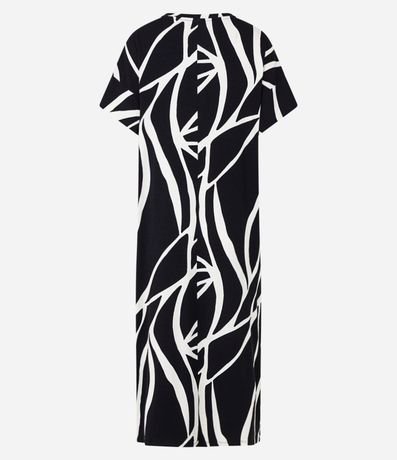 Ref: Vestido reto midi de mangas curtas, confeccionado em viscose, com gola redonda. Peça com estampa abstrata bicolor. Este produto possui viscose certificada em sua composição, sendo ambientalmente mais responsável.