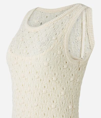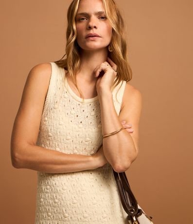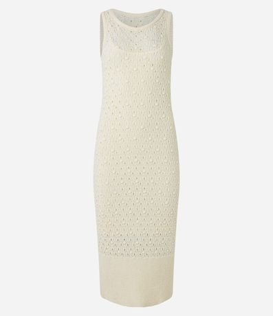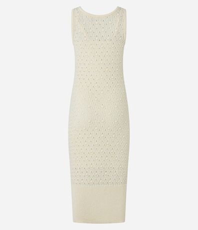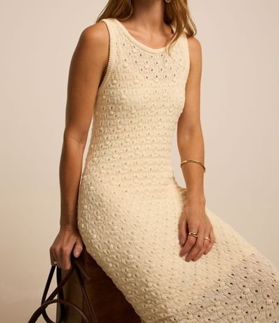 Vestido reto midi confeccionado em tricô leve com gola redonda e sem mangas. Possui tecido texturizado.
