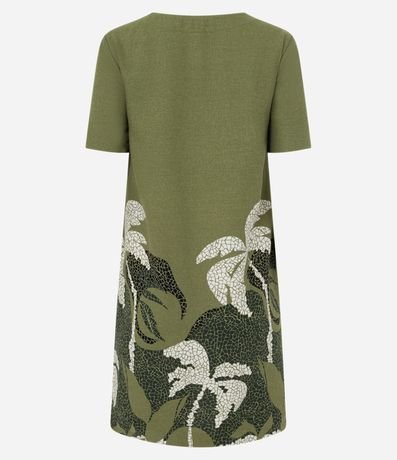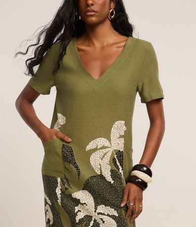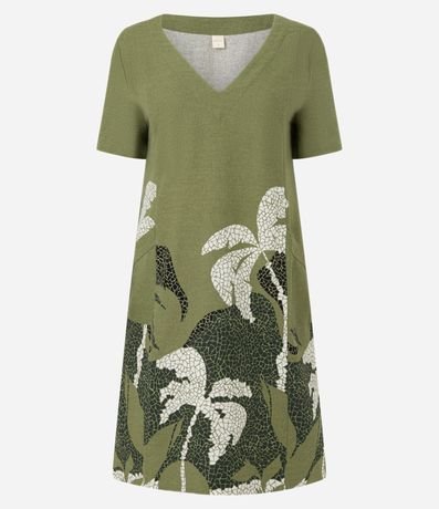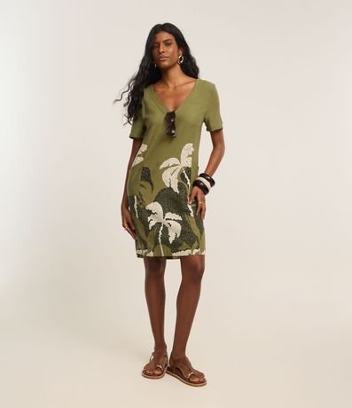 Ref: Vestido reto t-shirt, confeccionado em viscolinho, com decote V, mangas curtas e estampa de coqueiros em aspecto de ladrilhos. Este produto possui viscose certificada em sua composição, sendo ambientalmente mais responsável.