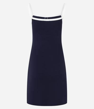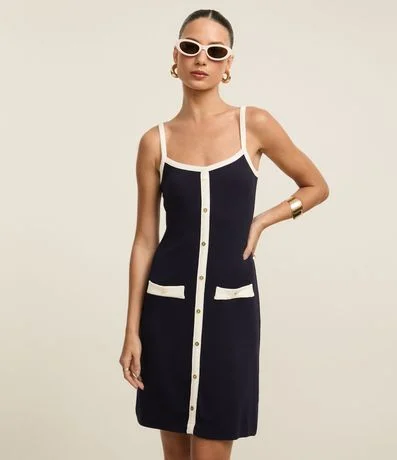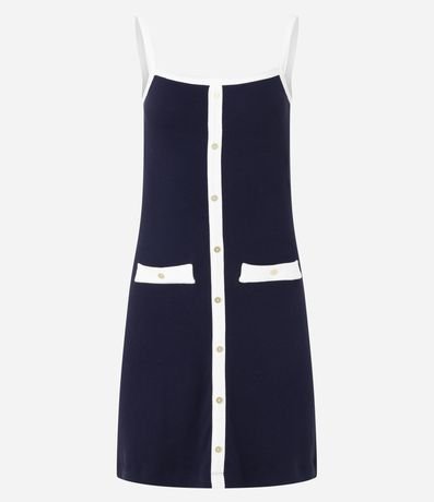 Vestido reto de comprimento curto e alças finas, confeccionado em ribana, com decote reto, abotoamento frontal e bolsos falsos com botões. A peça tem contrastes na alça, na vista e nos bolsos falsos, além de possuir tecido todo canelado. Este produto possui viscose certificado em sua composição, além de ter sido produzido através de processos mais sustentáveis com boas práticas ambientais, sendo ambientalmente mais responsável.