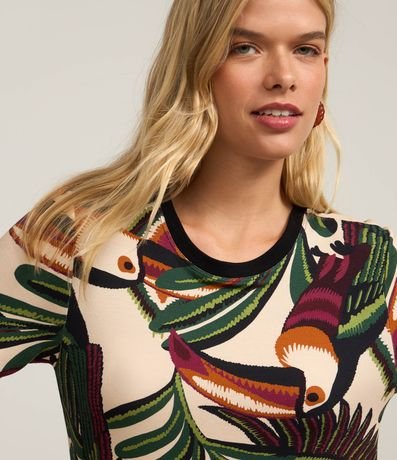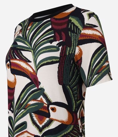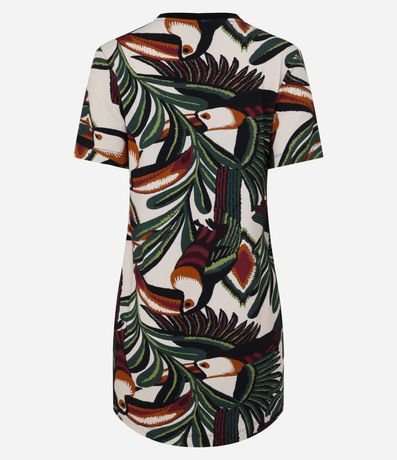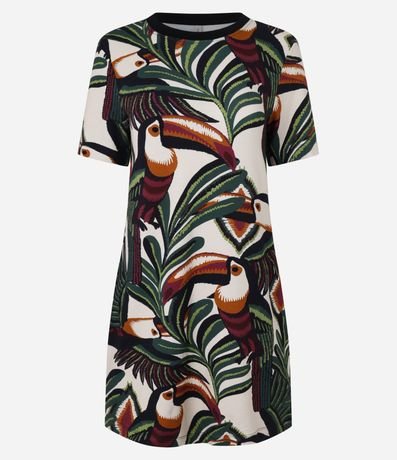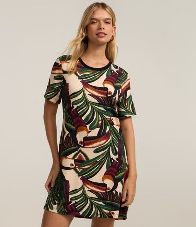 Ref: Vestido curto, t-shirt confeccionado em viscose e com estampa de folhagens.