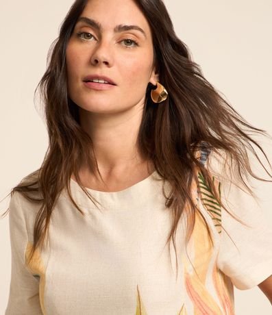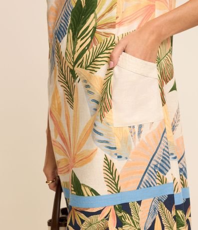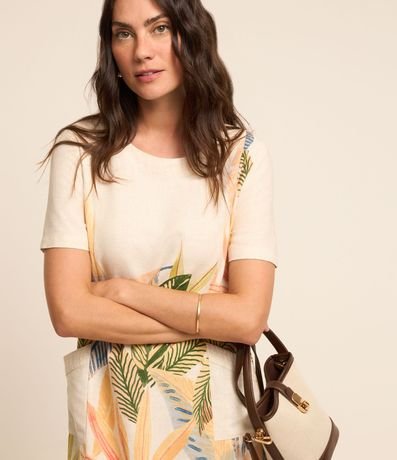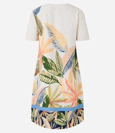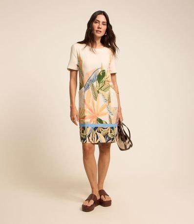 Ref: Vestido com comprimento acima dos joelhos confeccionado em viscolinho com gola redonda e mangas curtas além de folhagens estampadas por todo o item.