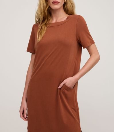 Ref: Vestido de modelo t-shirt, com comprimento acima dos joelhos, confeccionado em viscose, com mangas curtas e sem estampa. Possui bolsos nas laterais.