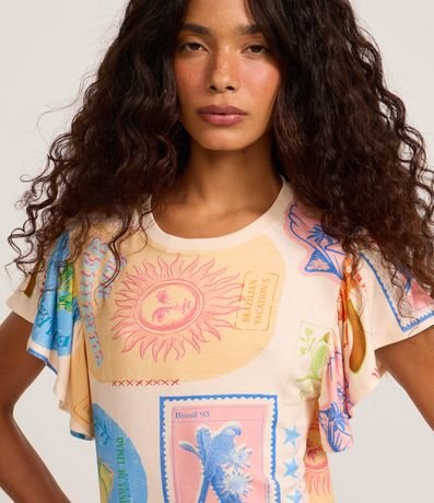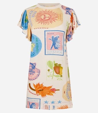 Vestido T-Shirt Dress Curto em Crepe com Estampa de Selos