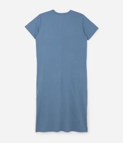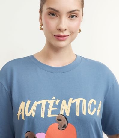 Ref: Vestido confeccionado em malha de algodão BCI, estilo camisetão. O vestido tem gola redonda, mangas curtas, fendas laterais e estampa frontal de frutas e letterin "autêntica e brasileira".
