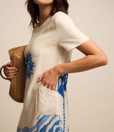 Ref: Vestido feminino, confeccionado em viscolinho mais sustentável, com decote redondo e manga curta. Peça no modelo t-shirt com estampa de natureza, trás imagem em contraste de cores que representam as ondas do mar e árvores.
