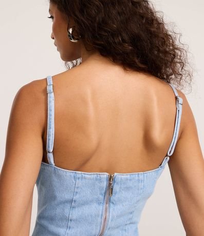 Vestido tubinho curto, sem mangas, confeccionado em jeans, com decote reto, alcinhas finas, fechamento por zíper nas costas e pences. Este produto possui algodão certificado em sua composição, sendo ambientalmente mais responsável.