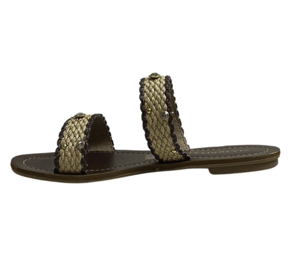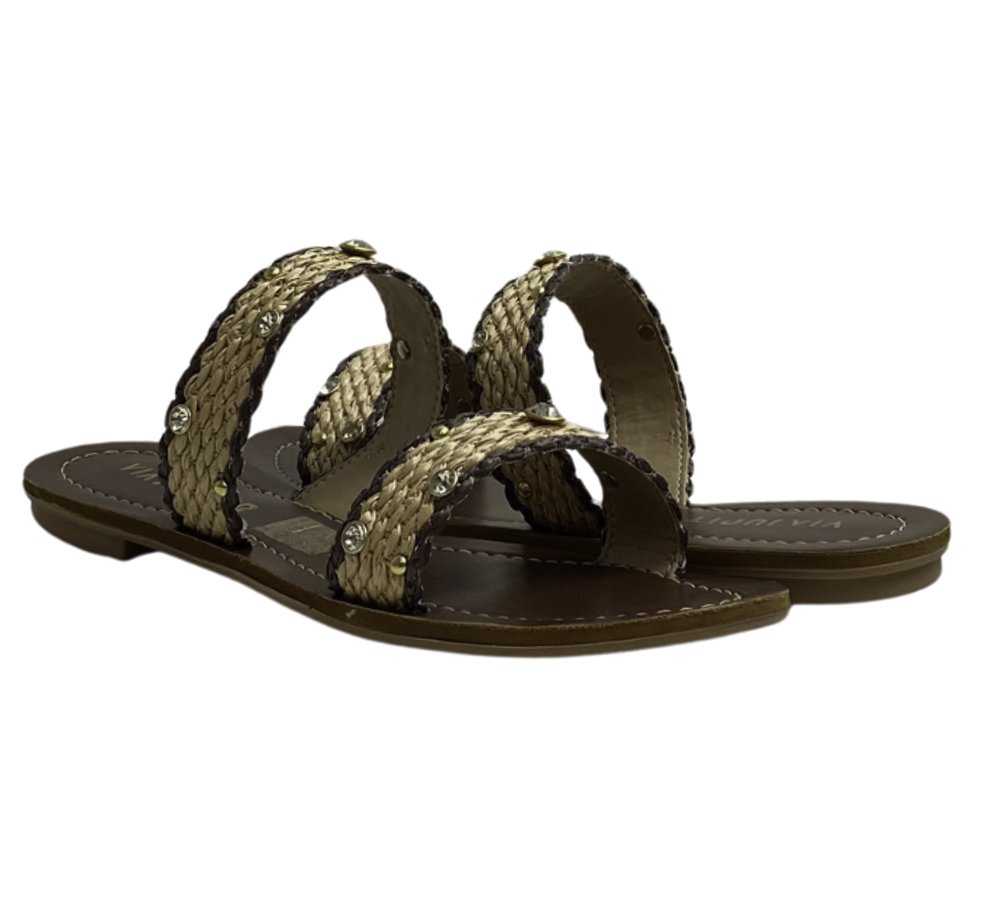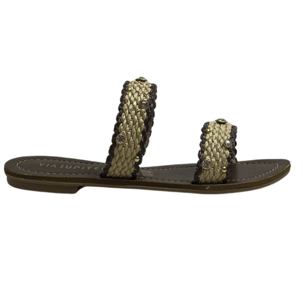 Ref: Rasteira Via Júpiter com cabedal em tiras tramadas, acabamento em detalhe trançado e aplicação de pedrarias que garantem charme e sofisticação. Um modelo leve e prático, perfeito para compor looks casuais com muito estilo.