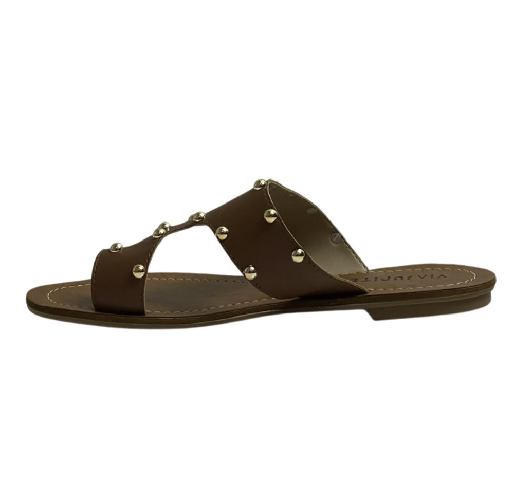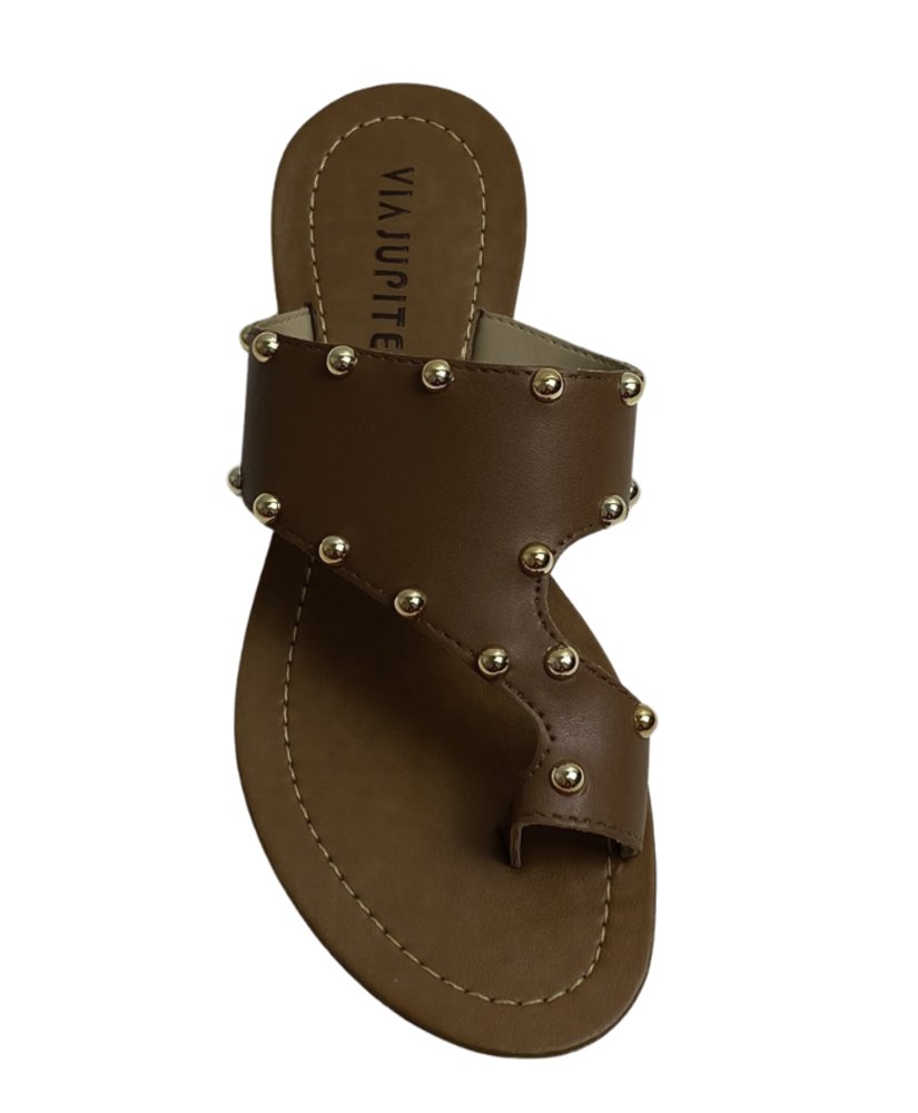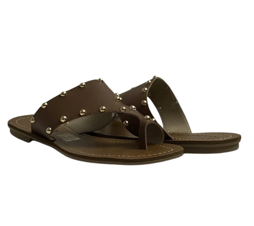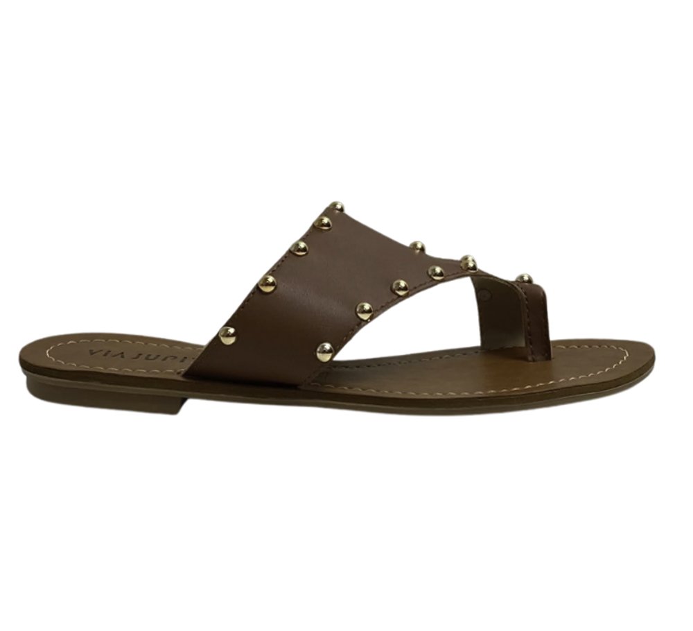 Ref: Rasteira feminina Via Júpiter com cabedal moderno adornado por aplicações metálicas que trazem charme e estilo. Modelo prático e confortável, perfeito para compor looks casuais com elegância no dia a dia.