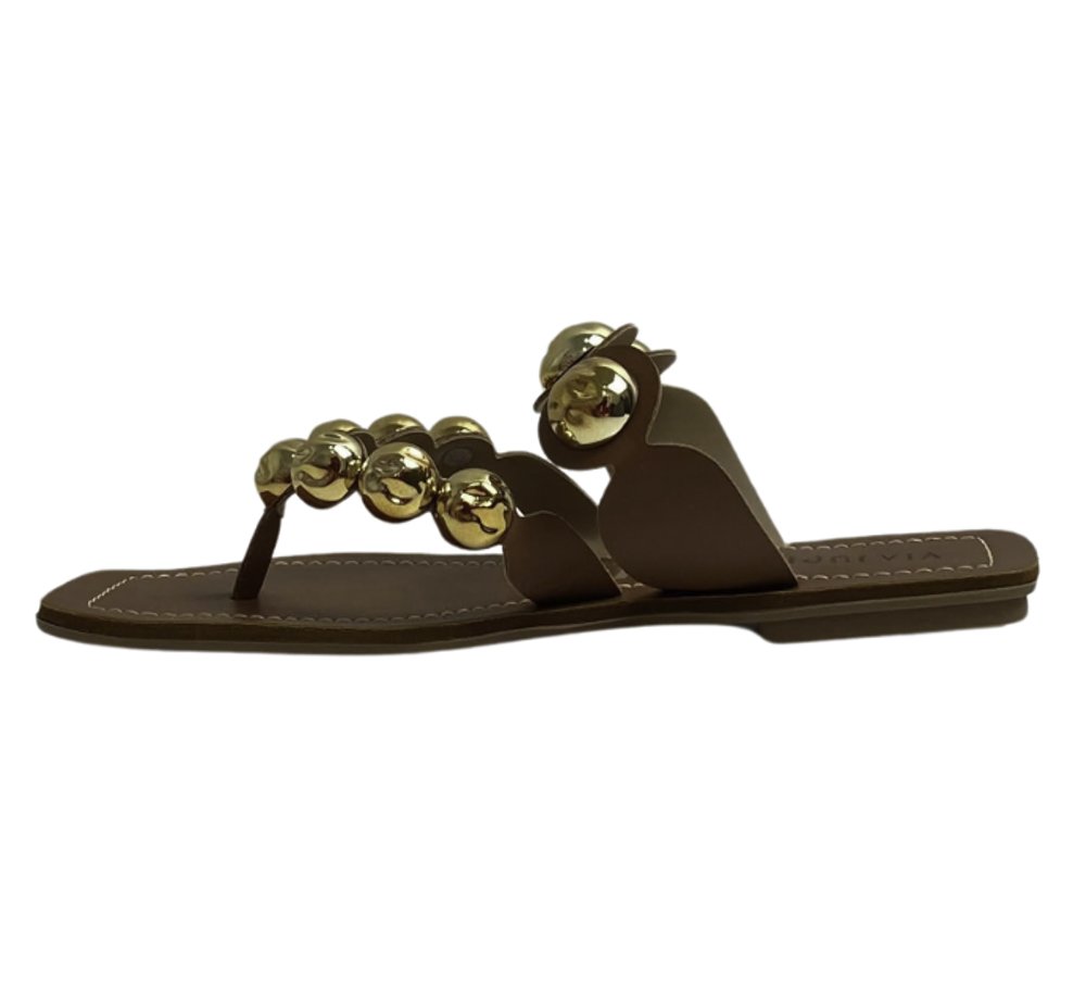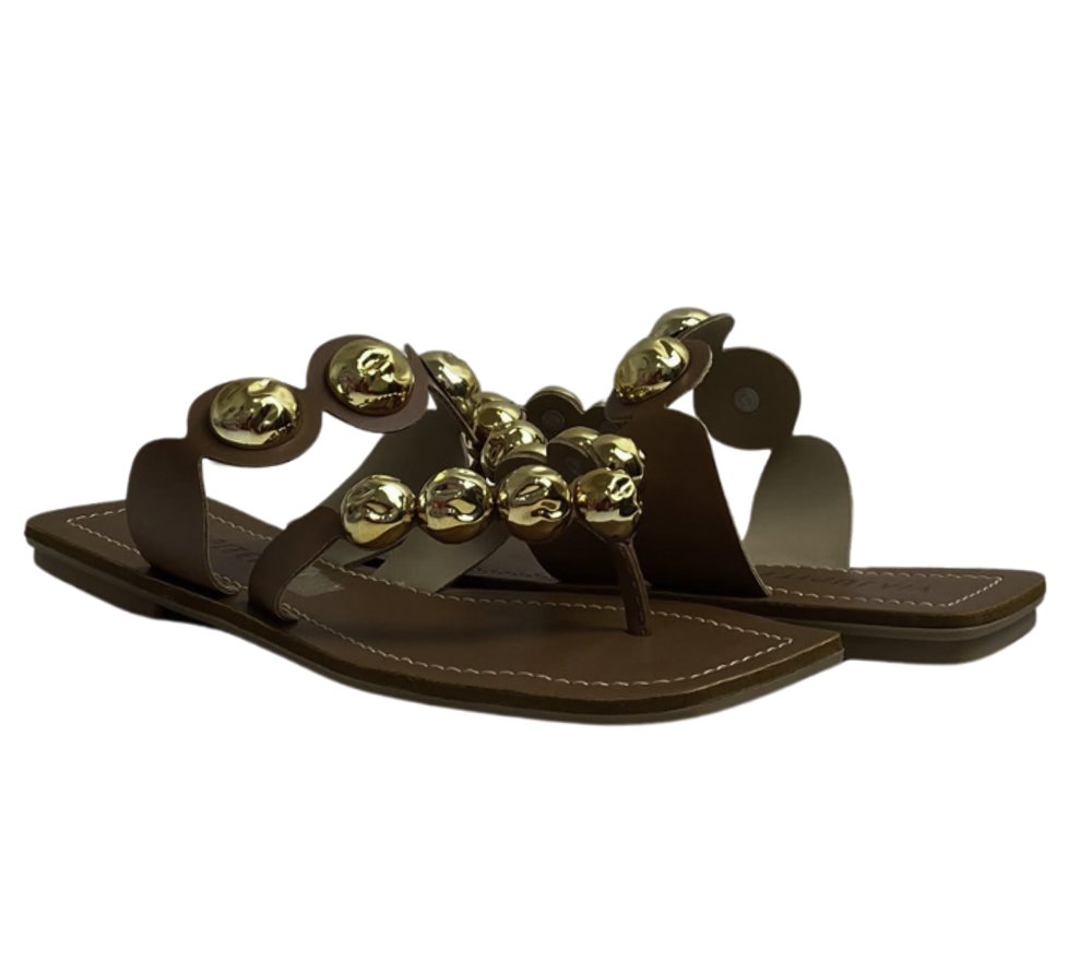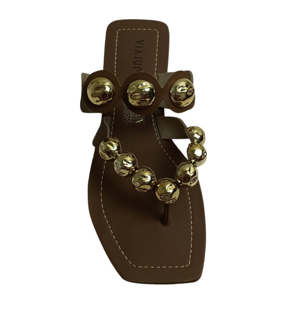 Rasteira Via Júpiter com tiras adornadas por esferas douradas, oferecendo um toque sofisticado e moderno para compor seus looks com estilo e conforto.