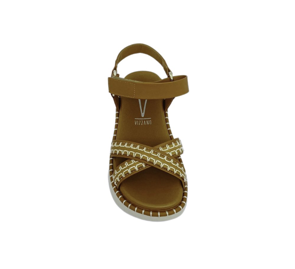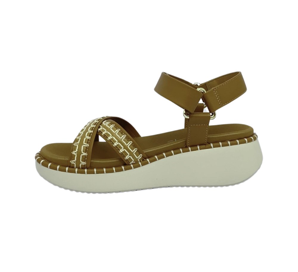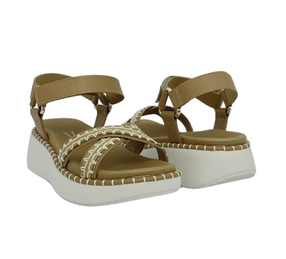 Sandália com um design contemporâneo, destaca-se pela tendência anabela. A parte frontal, com tiras cruzadas, proporciona conforto e firmeza aos pés. Os detalhes de moda, como as costuras decorativas, adicionam um toque de elegância ao calçado.