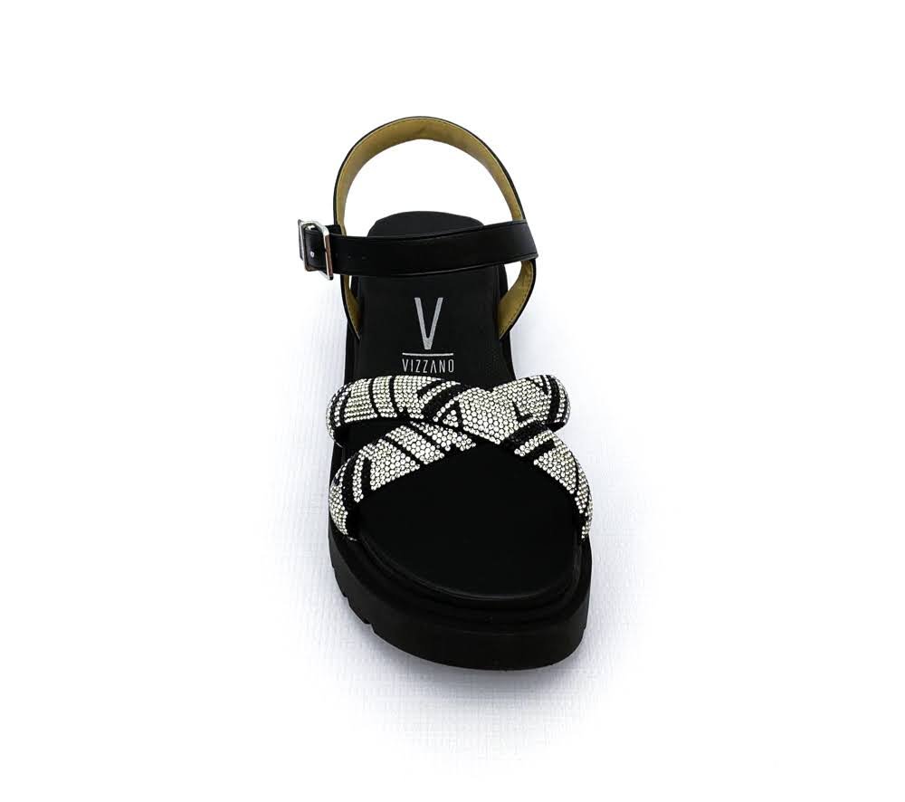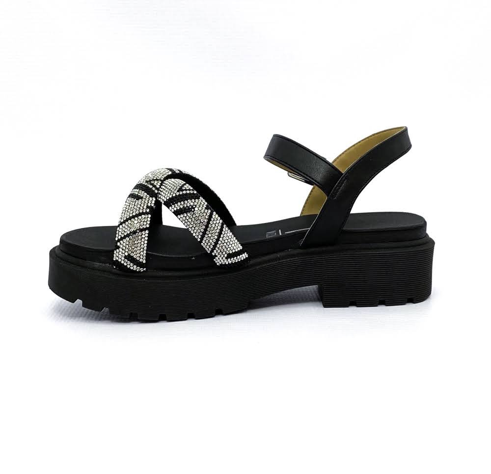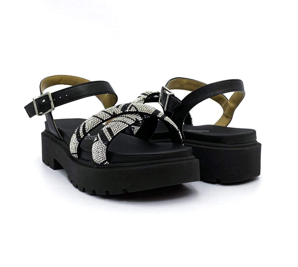 Ref: Sandália Vizzano tratorada. Seu cabedal com tiras largas e aplicação em strass traz um toque de glamour, enquanto o fechamento por fivela proporciona ajuste perfeito aos pés.