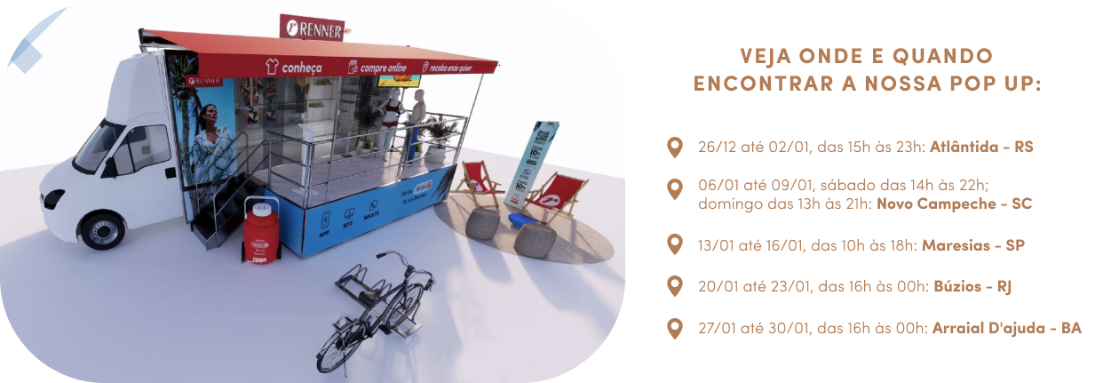 O verão da Renner pegou a estrada para levar cor, leveza e tendências para as praias do Brasil. Entre dezembro e janeiro, nossa loja itinerante vai percorrer 2.500 km, do sul ao nordeste do país. Enquanto curte o melhor da temporada, você vai poder garantir looks em uma nova experiência de compra. Continue lendo para saber mais!