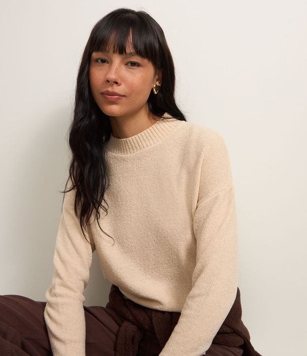 Suéter em Tricô Texturizado com Cava Deslocada Bege